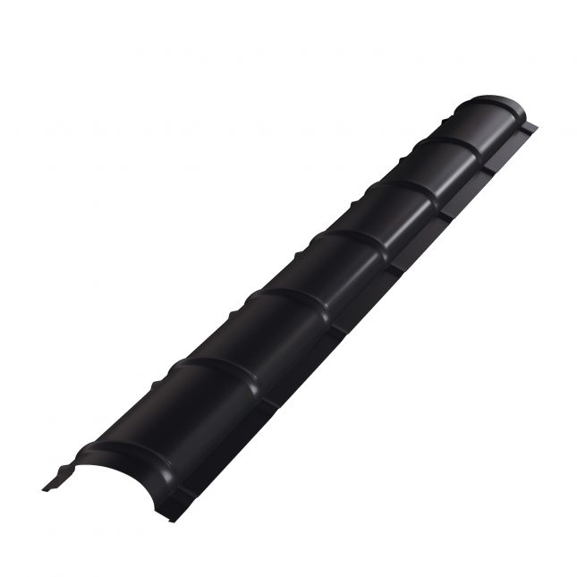 Коник круглий має не лише практичність, але й красується на даху надзвичайно ефектно. Особливо він підійде для складних вальмових покрівель. Монтаж ковзана легкий, а з використанням конусних заглушок ваша покрівля буде виглядати завершено і стильно.