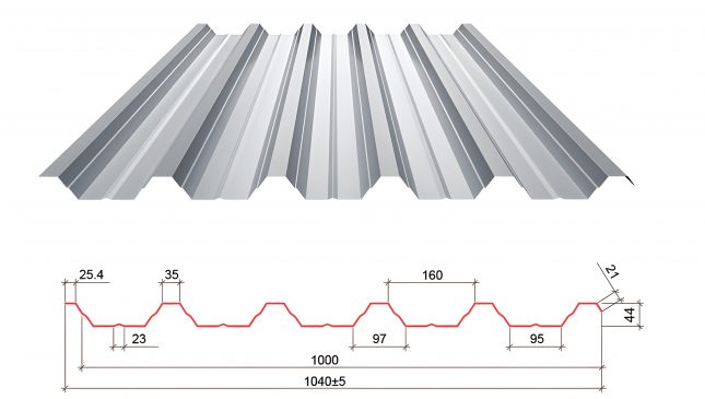 Товщина профнастилу – 0,40 мм, колір – Бежевий RAL 1015. Ширина загальна – 1040 мм, корисна – 1000 мм, висота хвилі – 44 мм, довжина – від 450 до 14000 мм. Постачальник матеріалу – Китай.